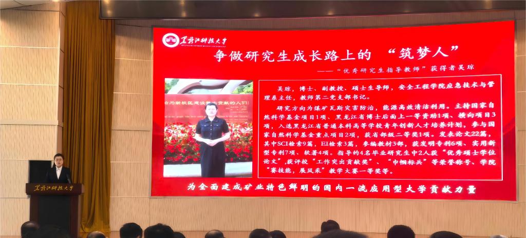 在育人与科研的道路上,她从不认为自己是“孤军奋战”。我校众多优秀的教师同仁,他们在科研上潜心钻研、在育人中用心付出,始终是她学习的榜样。她说,“优秀研究生指导教师”的称号不仅是一份荣誉,更是一份沉甸甸的责任。未来,她会继续深耕安全科学与工程研究领域,积极参与博士学位授权点筹备、学科评估等工作,为研究生搭建更优平台,为全面建成矿业特色鲜明的一流应用型大学贡献更大的力量。