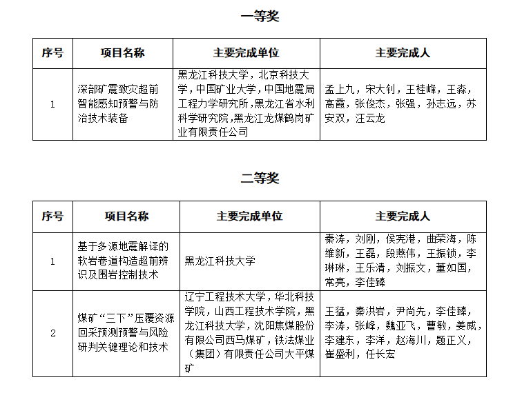 近日,应急管理科技创新奖励委员会办公室公布了第一届应急管理科技创新奖获奖名单,我校喜获一等奖1项、二等奖2项。其中,孟上九教授主持完成的“深部矿震致灾超前智能感知预警与防治技术装备”项目获一等奖,秦涛教授主持完成的“基于多源地震解译的软岩巷道构造超前辨识及围岩控制技术”项目获二等奖,李佳臻老师参与完成的“煤矿‘三下’压覆资源回采预测预警与风险研判关键理论和技术”项目获二等奖。