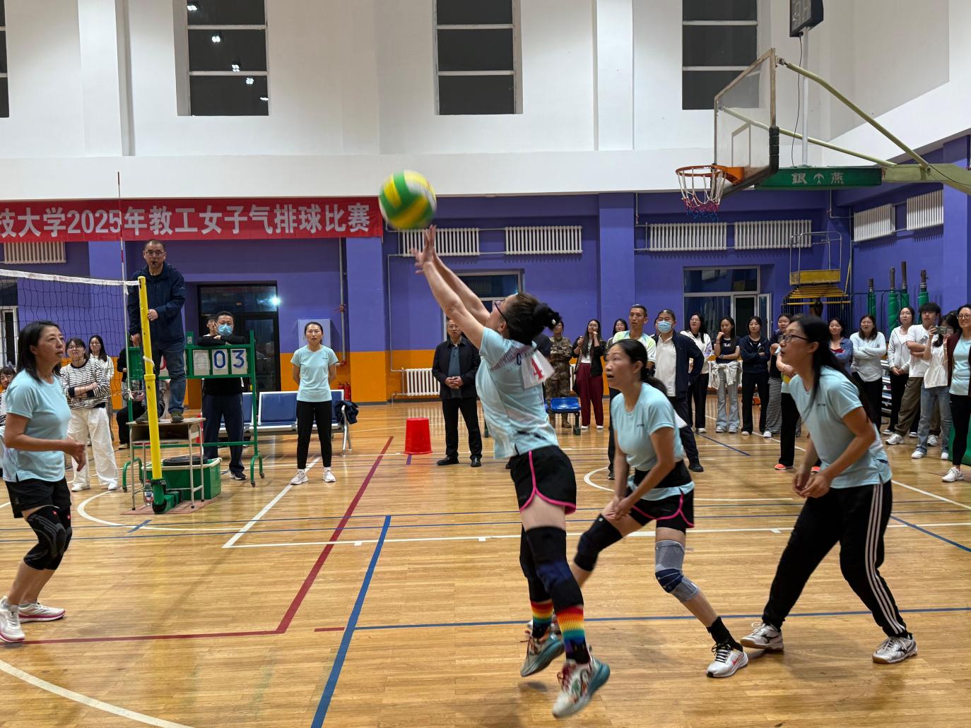 赛场上,精准默契的传球、霸气侧漏的扣球、干净利落的拦网、灵敏迅捷的防守……,个人技术与团队战术完美融合,充分展现出我校气排球的竞技水平,不断将比赛推向高潮;赛场上,加油声、呐喊声、欢呼声此起彼伏,运动员拼搏精神点燃的激情也进一步彰显了我校女教职工的昂扬斗志。
