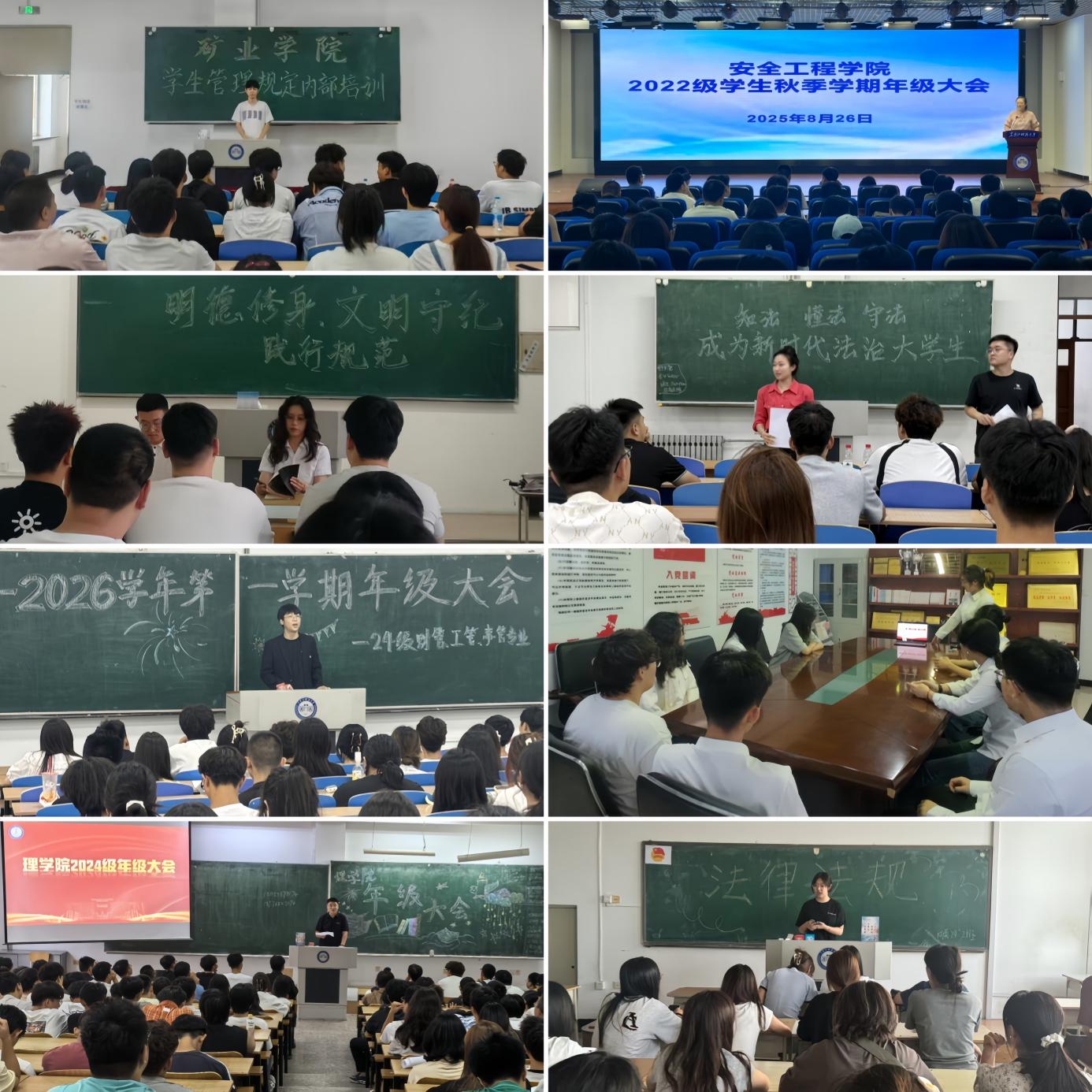 上好行为养成的“规矩课”。各学院紧扣《中华人民共和国宪法》《中华人民共和国治安管理处罚法》等法律法规核心内容,结合《学生管理规定》等文件要求,以大学校园常见违法违纪与不文明行为案例为抓手,依托年级大会、班长团支书专题会议、专题培训等途径,帮助学生明晰法律边界、增强法治意识,持续引导学生规范日常行为。通过师生共同制定公约、签署承诺书、主题知识问答等方式,教育学生在遵纪守法的同时,注重言行举止,养成良好的学习和生活习惯,彰显科大学子文明守礼的青春风采。矿业学院、电气学院开展法规法纪与《学生管理规定》专题培训,引导学生正确理解规章要求,从思想根源强化规矩意识与法治观念;材料学院开展文明行为养成专题教育,聚焦日常行为细节,教育学生从点滴处培育良好行为素养;经济学院、马克思主义学院开展普法宣传活动,用通俗化、场景化的普法讲解,帮助学生树立法治观念,以法治力量护航青春成长;外国语学院开展专题宣讲,引导学生敬畏规则、遵守纪律,牢固树立纪律红线。