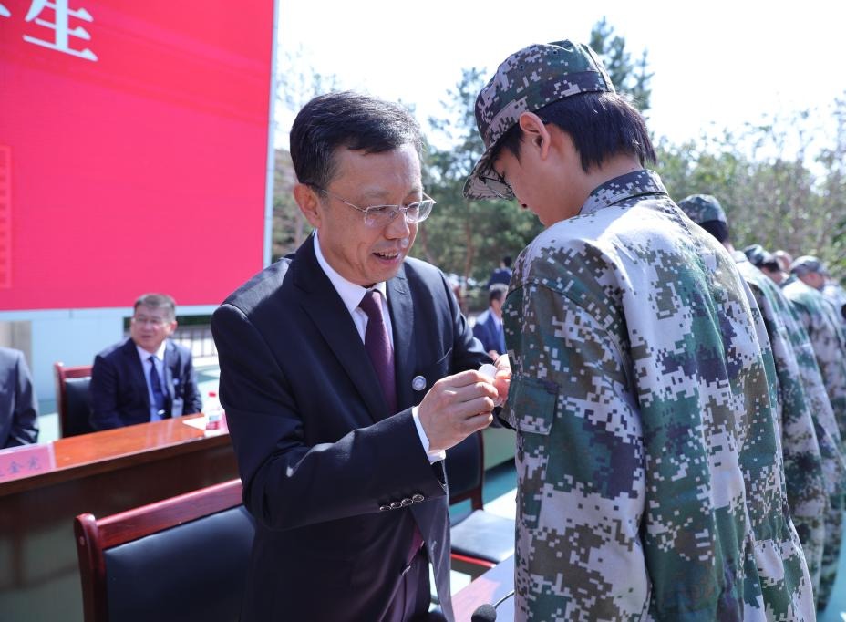 典礼上举行了新生佩戴校徽仪式,校领导为新生代表佩戴校徽。