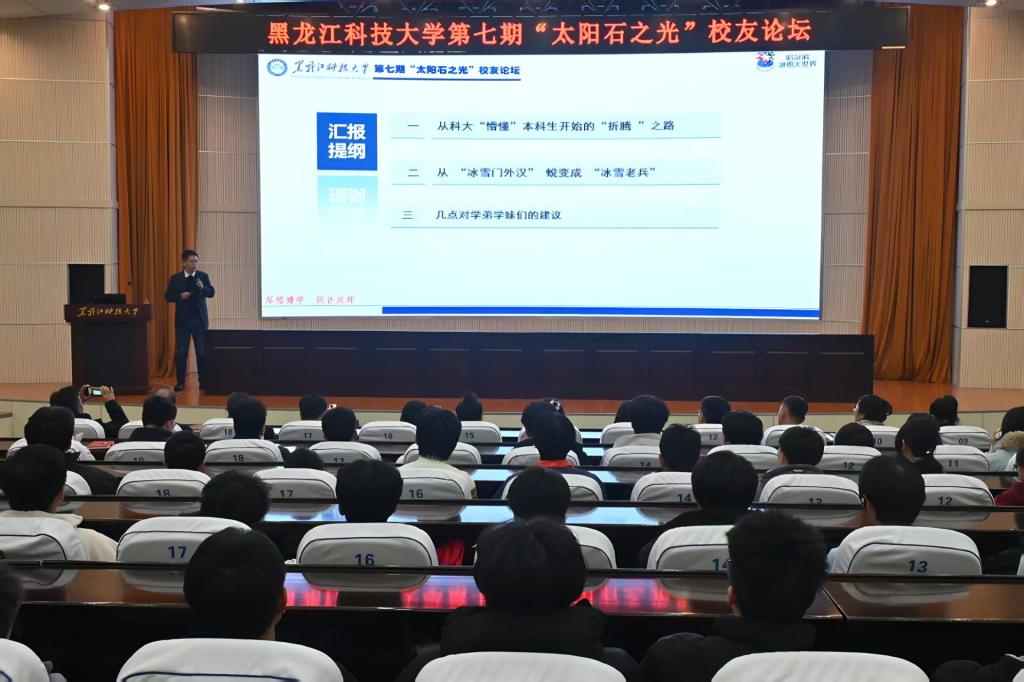 调研后,丛配玉以“从科大学子到冰雪老兵——我的跨界成长路”为主题,做客我校第七期“太阳石之光”校友论坛,为在校学生讲授了自己的跨行业实践和成长经验。