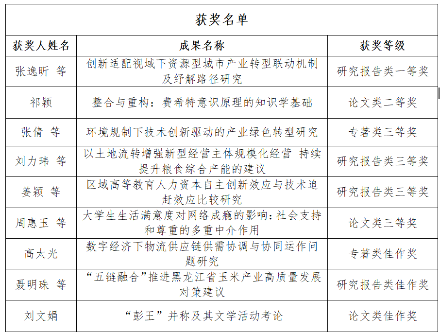 黑龙江省社会科学优秀成果奖是由中共黑龙江省委、黑龙江省人民政府批准设立的全省社会科学研究领域最高奖项,旨在繁荣发展黑龙江省社会科学事业,充分调动全省社会科学工作者科研积极性和创造性。此次获奖,是对学校哲学社会科学实力的充分肯定,更是对全校社科工作者深耕学术、勇于创新的激励。