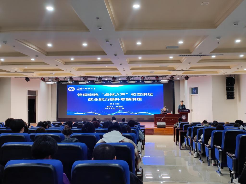 结合黑龙江科技大学2024届毕业生《“踔厉奋发 勇往职前”就业教育促进月》活动方案,把握“金九银十”就业黄金期,精准开展就业指导与帮扶,10月13日,管理学院在朝阳楼0131室举办了第十三期“卓越之声”校友讲坛,特邀财务会计学专业2009届优秀校友,黑龙江省七台河市工信局副局长董隽哲,围绕就业能力提升开展专题讲座。学院全体毕业班辅导员及200余名2024届毕业生参加本次讲坛,讲坛由学院党委副书记徐海英主持。