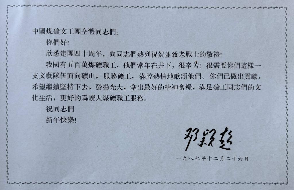 邓颖超写给中国煤矿文工团成立四十周年的贺信
