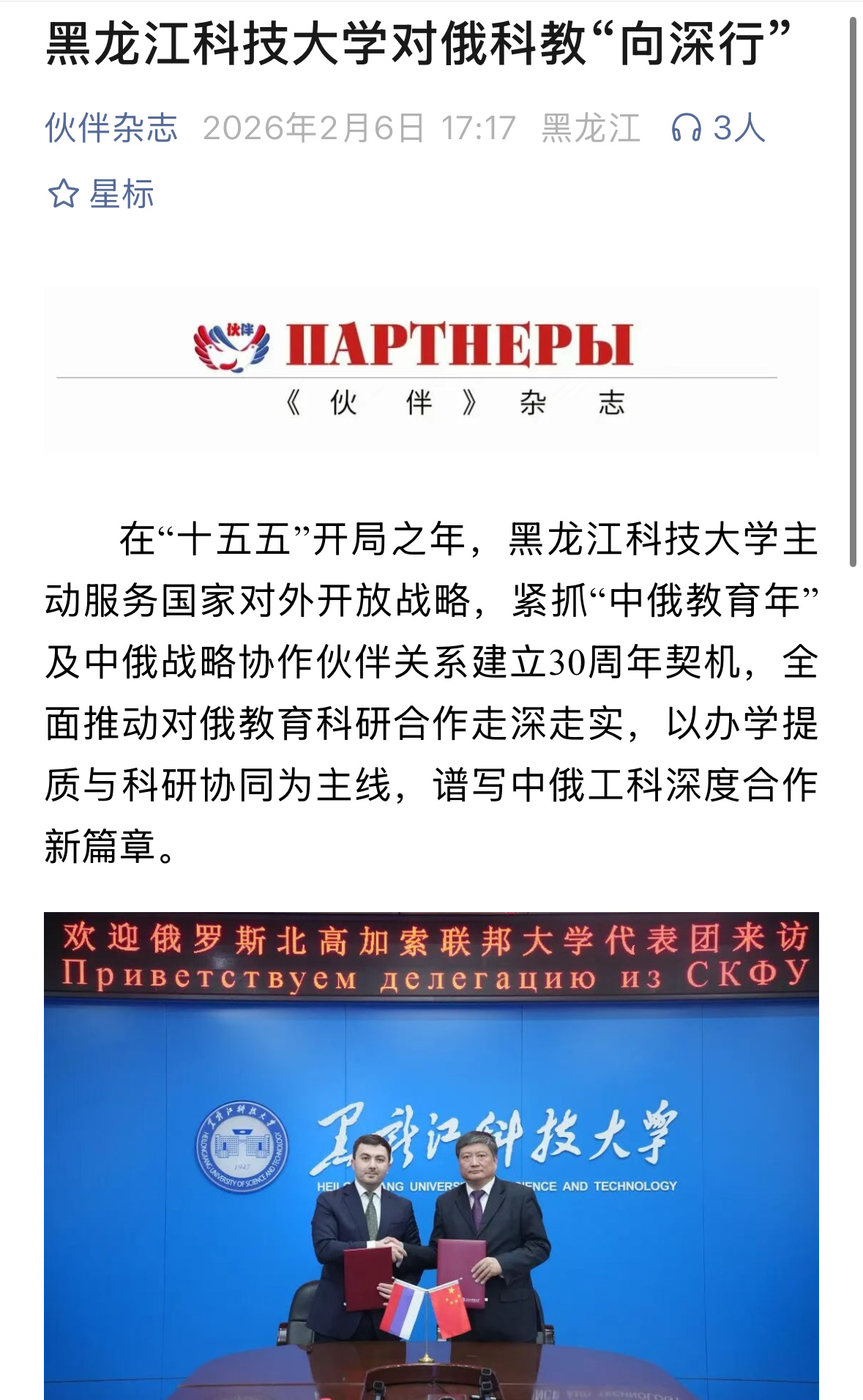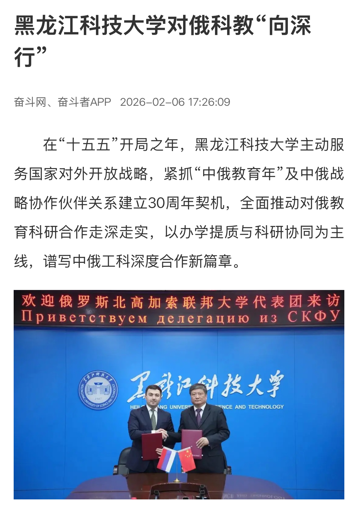 在“十五五”开局之年,黑龙江科技大学主动服务国家对外开放战略,紧抓“中俄教育年”及中俄战略协作伙伴关系建立30周年契机,全面推动对俄教育科研合作走深走实,以办学提质与科研协同为主线,谱写中俄工科深度合作新篇章。